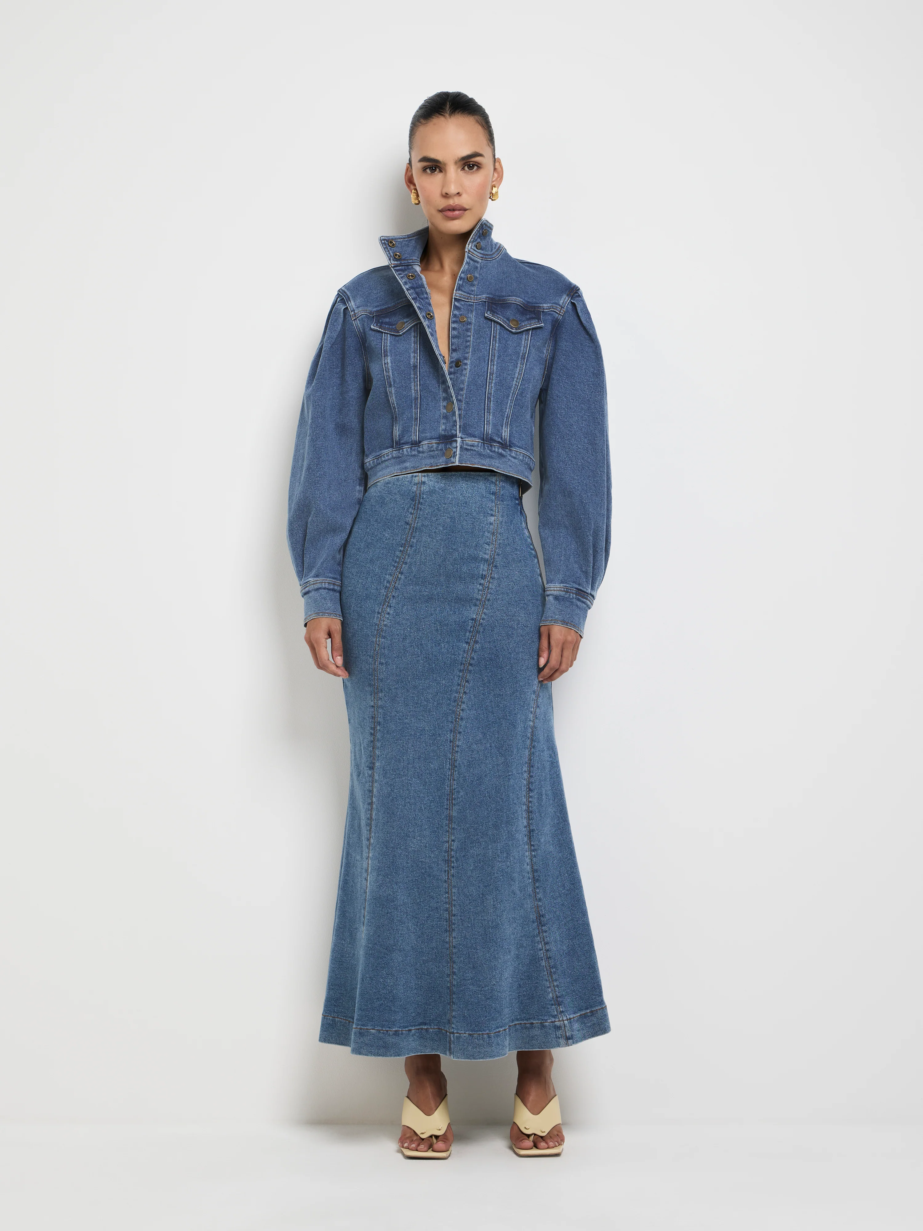 Day-to-Night Denim - Introducing the Ria Jacket! Showcasing a denim fabrication, collar neckline, snap front closure, long sleeves, crop length and cuff and hem band. Pair back with our matching Ria Denim Skirt and Claudine Bodysuit to complete your look.